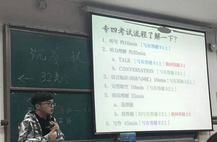 活动伊始,2015级学长邵宇杰针对倒计时仅剩一周时间的英语专业四级考试提出建议,从听力、单选、完型、阅读等多个部分总结找工作四紧急训练法,为学弟学妹们打气。最后,学长以“立足专四,展望未来”为结束语,从保研、考研、出国、直接个方面对同学们提出了不同的期待。面对学长一系列直击心灵的“灵魂叩问”,同学们积极互动,现场气氛十分欢乐。