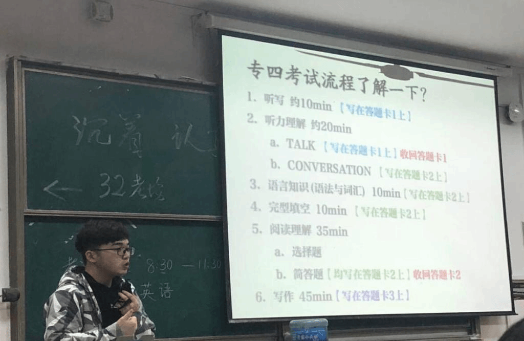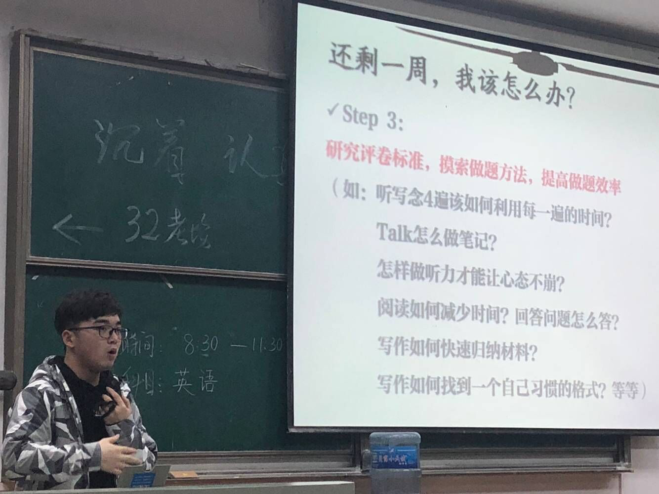 活动伊始,2015级学长邵宇杰针对倒计时仅剩一周时间的英语专业四级考试提出建议,从听力、单选、完型、阅读等多个部分总结紧急训练法,为学弟学妹们打气。最后,学长以“立足专四,展望未来”为结束语,从保研、考研、出国、直接找工作四个方面对同学们提出了不同的期待。面对学长一系列直击心灵的“灵魂叩问”,同学们积极互动,现场气氛十分欢乐。