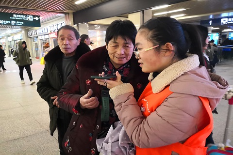 地下售票厅中,一对爷爷奶奶久久未等来排队买票的儿子,恰巧手机欠费,只能焦急地向志愿者寻求帮助。于是她带着爷爷去十几米远的服务台借用公共电话。得到工作人员表示没有公用电话的回答后,不忍看见老人失落的神情,她决定把她自己的手机借给老人。两位老人联系到了儿子后,满面笑容地向志愿者表达感谢。
