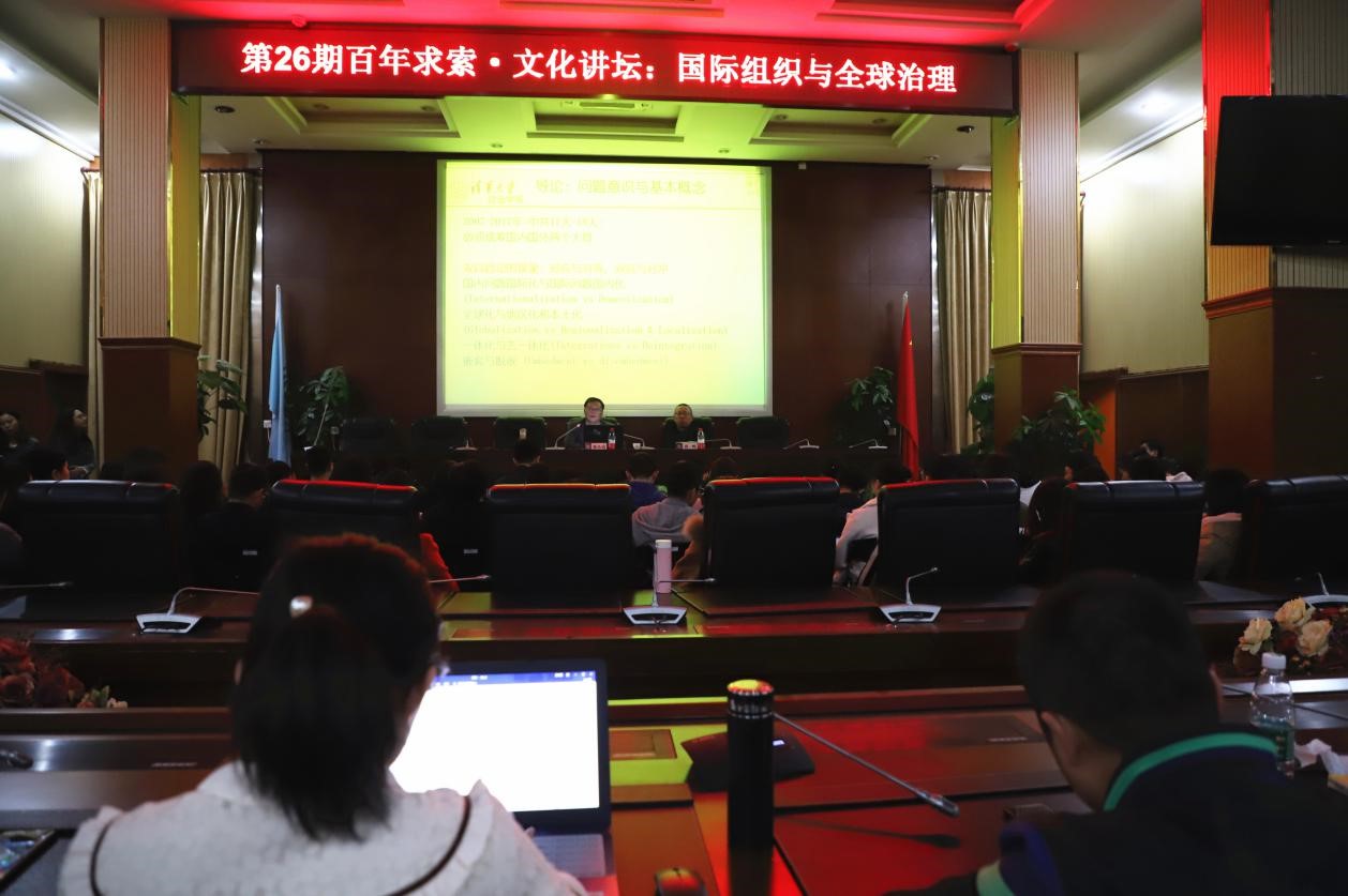 华大桂声讯 2018年12月1日晚上7:00,由华中师范大学研究生会主办,政治与国际关系学院研究生会承办的第26期“百年求索·文化讲坛”在模拟联合国会议室举行。清华大学教授张小劲带来了以“国际组织与全球治理”为主题的讲座。本次讲座由政治与国际关系学院院长唐鸣主持,政治与国际关系学院及其他学院的众多学生聆听了本次讲座。