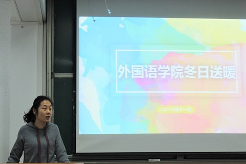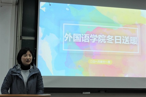 “冬日送暖活动”在王莉的亲切问候中正式拉开帷幕,她介绍道,“冬日送暖活动”是外国语学院每年的传统活动,是外国语学院的领导老师们对同学们的关爱与鼓励。学院高度重视这项活动,领导老师们通过走访,了解实际情况,给真正需要的同学送去异乡中来自学院的温暖与关爱。“武汉的冬天就好像任性的孩子,这两天气温也有所回升,但天气预报中也说了,接下来武汉将迎来大幅度降温。而我们的这项活动就是力所能及地帮助同学们在华中师范大学,在外国语学院度过一个有意义的冬天。我们希望你们不仅仅能得到身体上的温暖,更能体会到心灵上的温暖。”