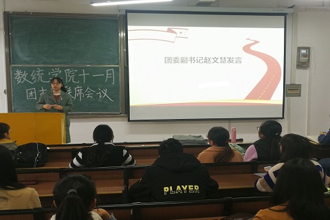 11月18日中午,数学与统计学学院十一月份团支书联席会议在六号楼6201教室如期举行。本次会议主要介绍了的十一月团日活动的主题、内容、要求和材料上交的时间,旨在鼓励同学们珍惜学习时光,心无旁骛的求知问学,切身落实“胸怀责任,发奋读书”倡议书内容。数统学院团委副书记赵文慧,组织部部长迟迅宏,组织部副部长曹汝佳、朱银赫以及组织部所有干事,17、18级各班团支书出席本次会议。