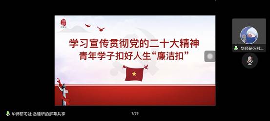 人工智能教育学部讯(见习记者 程淼)为学习宣传贯彻党的二十大精神,使团委学生会成员深刻认识党的二十大的重要意义,充分了解中国近年来的发展,促进青年团干成长和鼓励团干做好学生服务工作,11月6日下午,人工智能教育学部以“学习宣传贯彻党的二十大精神,青年学子扣好人生‘廉洁扣’”为主题线上开展了团干培训活动。本次培训活动由华中师范大学习近平新时代中国特色社会主义思想研习社成员岳曈昕担任主讲人,人工智能教育学部团委学生会全体成员,2022级年级委员,2022级各班班长、团支书参与培训活动。