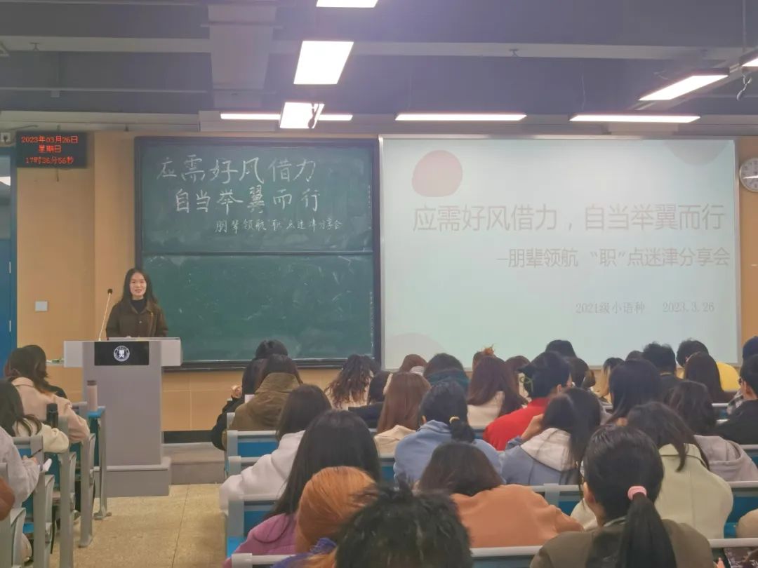 在“朋辈领航”分享会——外交部定向培养人专场结束之后,为进一步满足同学们的生涯规划需求,引导个人潜能发挥、帮助确立发展目标,外国语学院2021级小语种于3月19日晚和3月26日晚在8216教室分别举办了两场“朋辈领航 ‘职’点迷津”分享会。本轮分享会以就业与职业生涯规划为主题,邀请了2019级俄语系的朱德铖和2019级韩语(朝鲜语)系的皮宇嘉进行经验分享。本轮分享会由2021级日语系的廖诗萁主持,2021级小语种全体同学及2021级小语种辅导员徐圆参会。