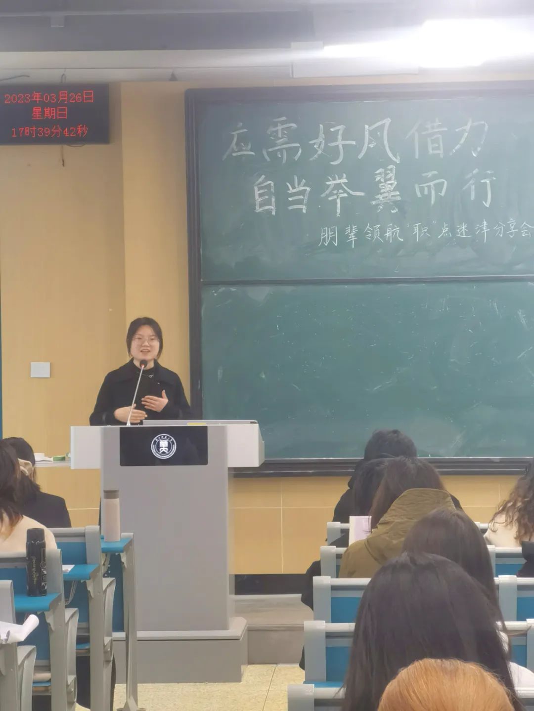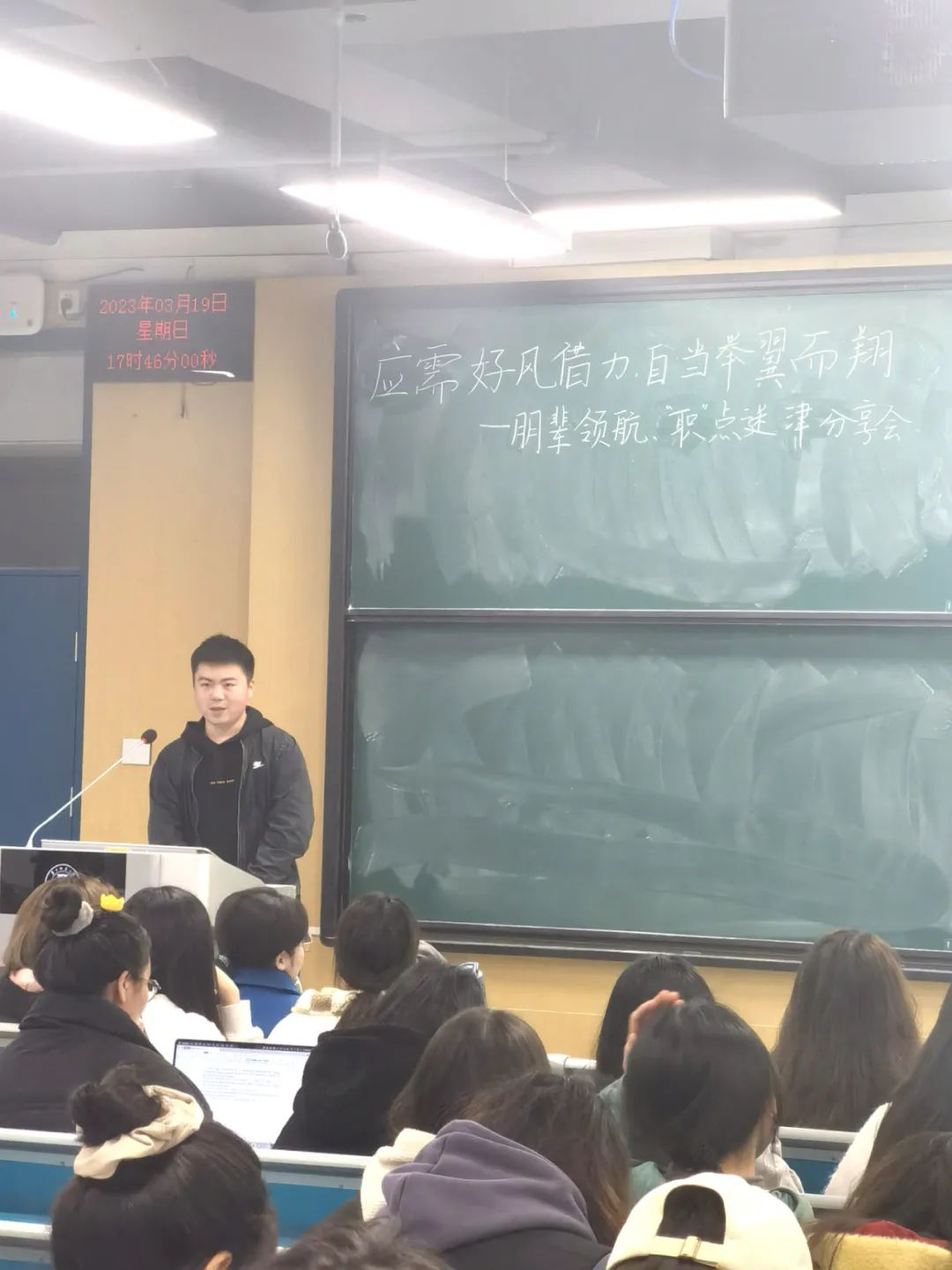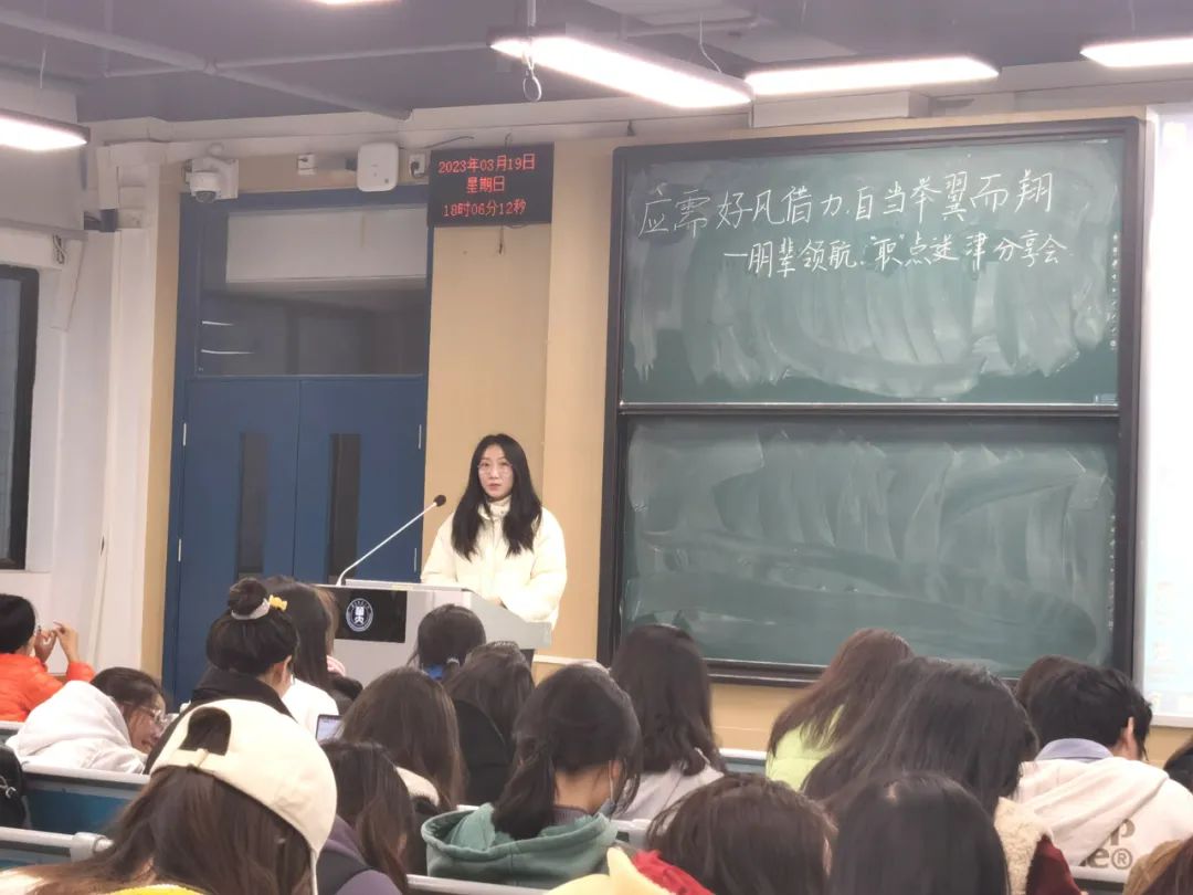 3月19日晚,朱德铖作为主讲人向同学们分享了自身经历与经验。他首先解答了同学们提出的“如何在不同方向中做选择”的问题,表示要根据自己的实际情况及兴趣等选择合适的道路。随后朱德铖讲述了他的军旅生涯故事。接着他回归到就业与择业的话题,将自己对于择业标准、面试技巧等方面的体会分享给了同学们。本场分享会的最后,徐圆进行了总结,并且鼓励同学们积极收集相关信息,为潜在的机会做好充分准备。