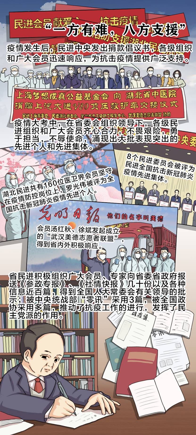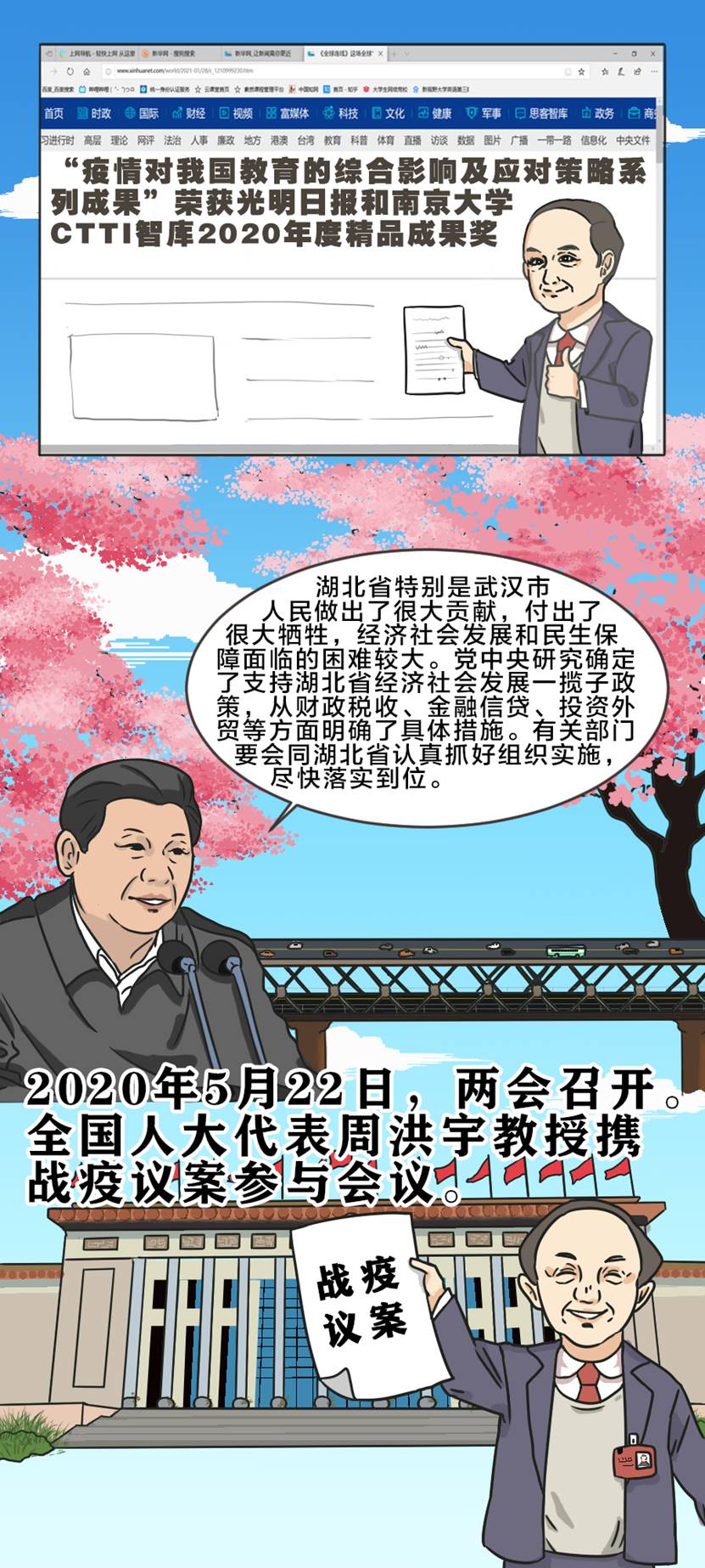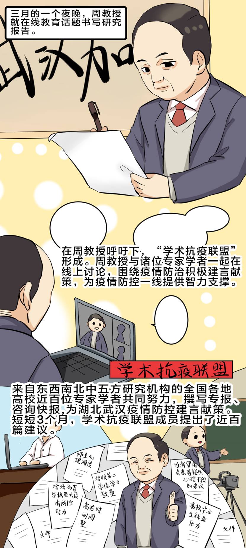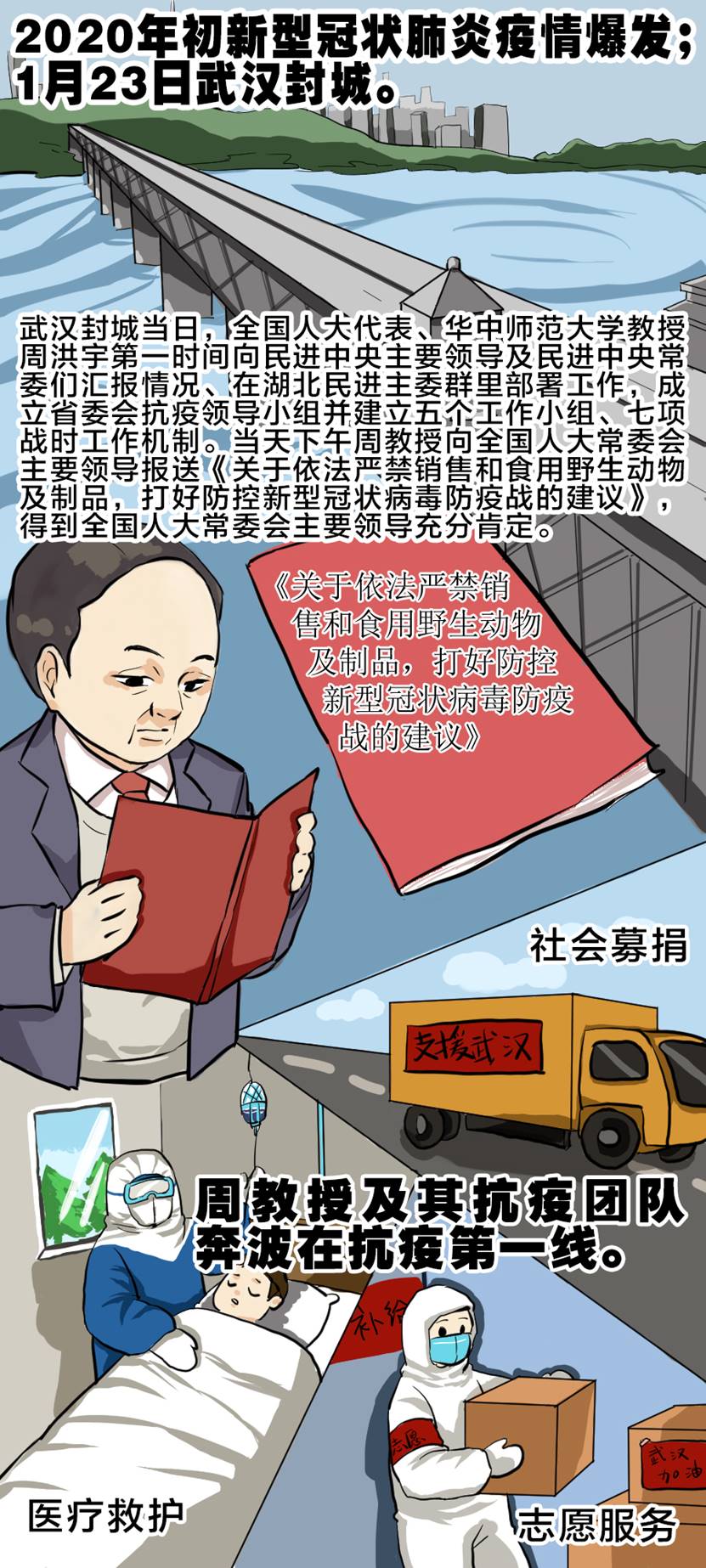“所有随风而逝的都是属于昨天的,所有历经风雨留下来的才是面向未来的。”迈进后疫情时代,曾经肆虐猖狂的病毒渐失凶色,当时人心惶惶的恐惧也变得风雨飘摇。但我们仍不能放松警惕,青山一道同风雨,跨过一个漫长不安的冬天之后,留给世界人民的,不应是风雨笼罩后的恐惧,而应是无所畏惧的精神:虽不似白衣无畏永逆行,亦应尽平生肝胆向上走。寒冬已去,春暖花开。回望抗疫时代涌现的无数英雄人物,仍然难掩激动和感动。全国人大代表、华中师范大学教授周洪宇在新冠疫情爆发后立即汇报情况、部署工作、建立工作小组与战时工作机制,奔波在抗疫一线,为疫情防控作出民进中央委员的努力和贡献。在国内疫情逐渐稳定后,周教授主动呼吁筹划学术抗议联盟,为武汉疫情防控提出近百篇建议。两会召开后,全国人大代表携战疫议案参与会议,为常态化疫情防控提出重要建议。透过漫画《周教授带领团队挺在抗疫一线》,一起来看看周教授在疫情中的努力与贡献吧!