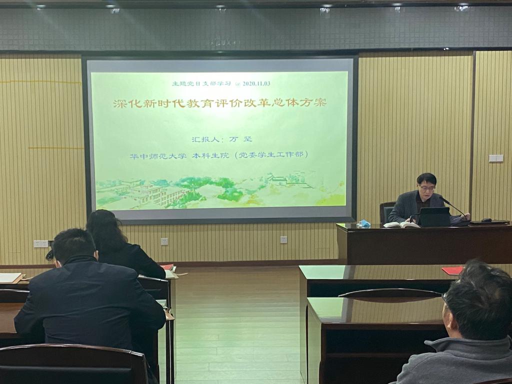 最后,本生院院长万坚同志领学《深化新时代教育评价综合改革总体方案》,他从宏观、中观、微观三个层面进行了解读。他指出,教育评价是指挥棒,决定着办学导向是否科学。我们要贯彻习近平新时代教育思想,以立德树人为主线、以破五维为导向、以五类主体为抓手深化新时代教育评价改革。在教育教学实际中应当以内化于心、外化于行的方式促进学生全面发展。