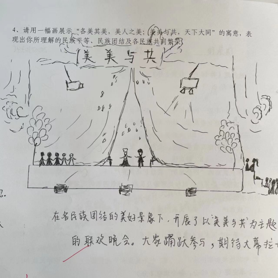 八节课程,教师们结合自身经历,用学生喜闻乐见的课程载体,深入浅出地讲解我国民族政策、宗教政策和学生教育管理要求;引导学生牢固树立正确的马克思主义五观,铸牢共同维护国家统一的思想根基,使民族团结进步教育深入人心。选修本次课程的同学们感受到“各美其美,美人之美;美美与共,天下大同”的深刻寓意,纷纷在试卷上描绘出自己心中的民族团结、各民族共同繁荣的和谐画卷,并表示在以后的学习、生活中将争做担当民族复兴大任的时代新人。