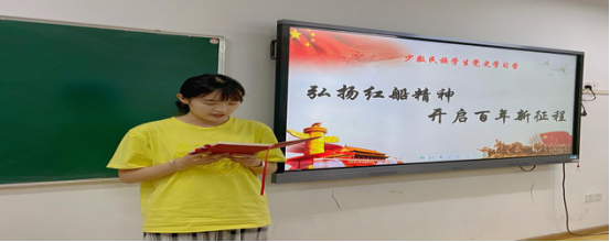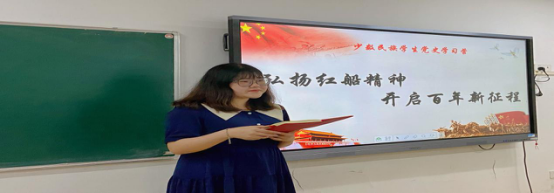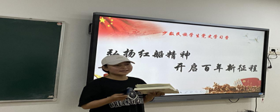 第四组帕娜尔、田丽娟和巴合江·阿扎马提同学基于前面同学的分享,对于当今时代青年应该担当的历史使命及奋斗路径提出了自己独特的看法,帕娜尔表示:“青年最富朝气与梦想,是民族未来与希望所在。当代青年要将改变个体命运与改变国家命运结合起来,为实现民族振兴和人民福祉而努力,在民族振兴中安放个体的青春和价值。”田丽娟则结合自己五一出游“橘子洲头”的所思所感进行分享,她表示此次出游就是一次“学党史、忆伟人”的实践。