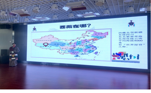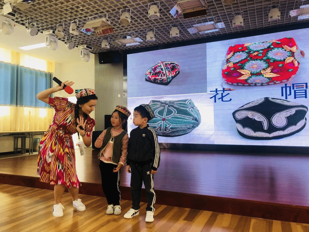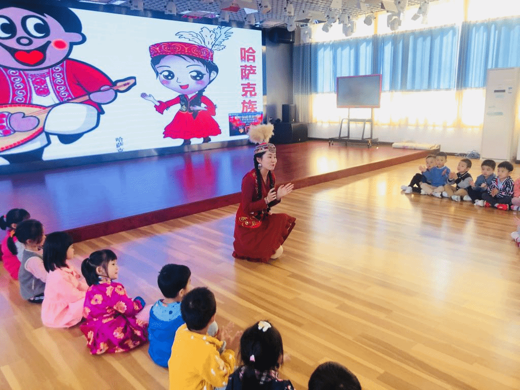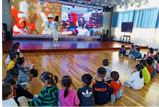 课堂上红石榴社团的维吾尔族、柯尔克孜族、藏族及哈萨克族等少数民族同学穿着民族服装热情洋溢地依次上台介绍了本民族的民族风情、服饰文化、饮食习惯、建筑特色等,采用体验式的授课方式,与学生互动教舞蹈动作、教学生献哈达、唱少数民族儿歌、试穿少数民族服装、观看民族团结教育视频等,使幼儿园师生观察、感受、体验到了不同民族的文化魅力,理解多民族和谐共处的道理。