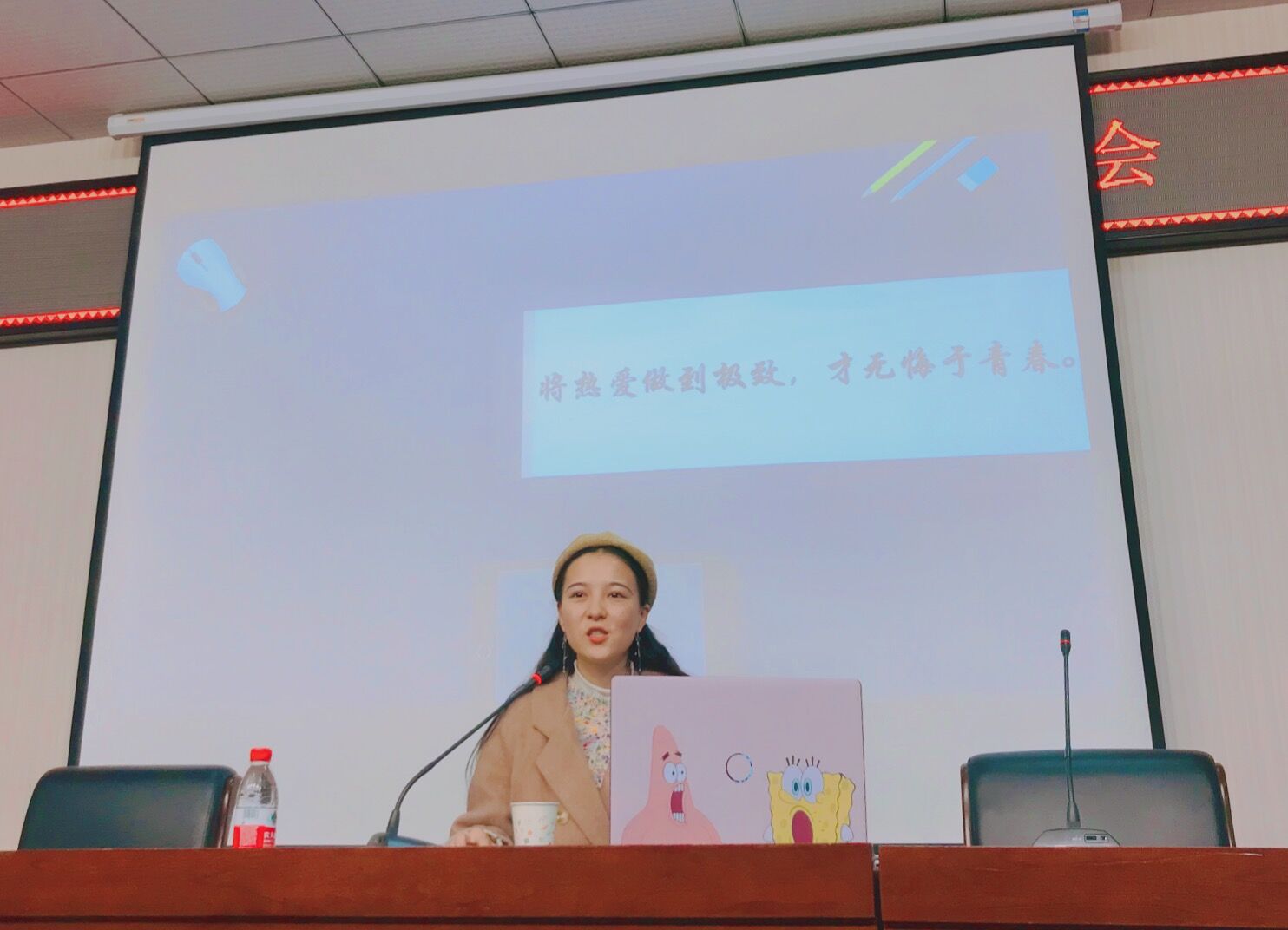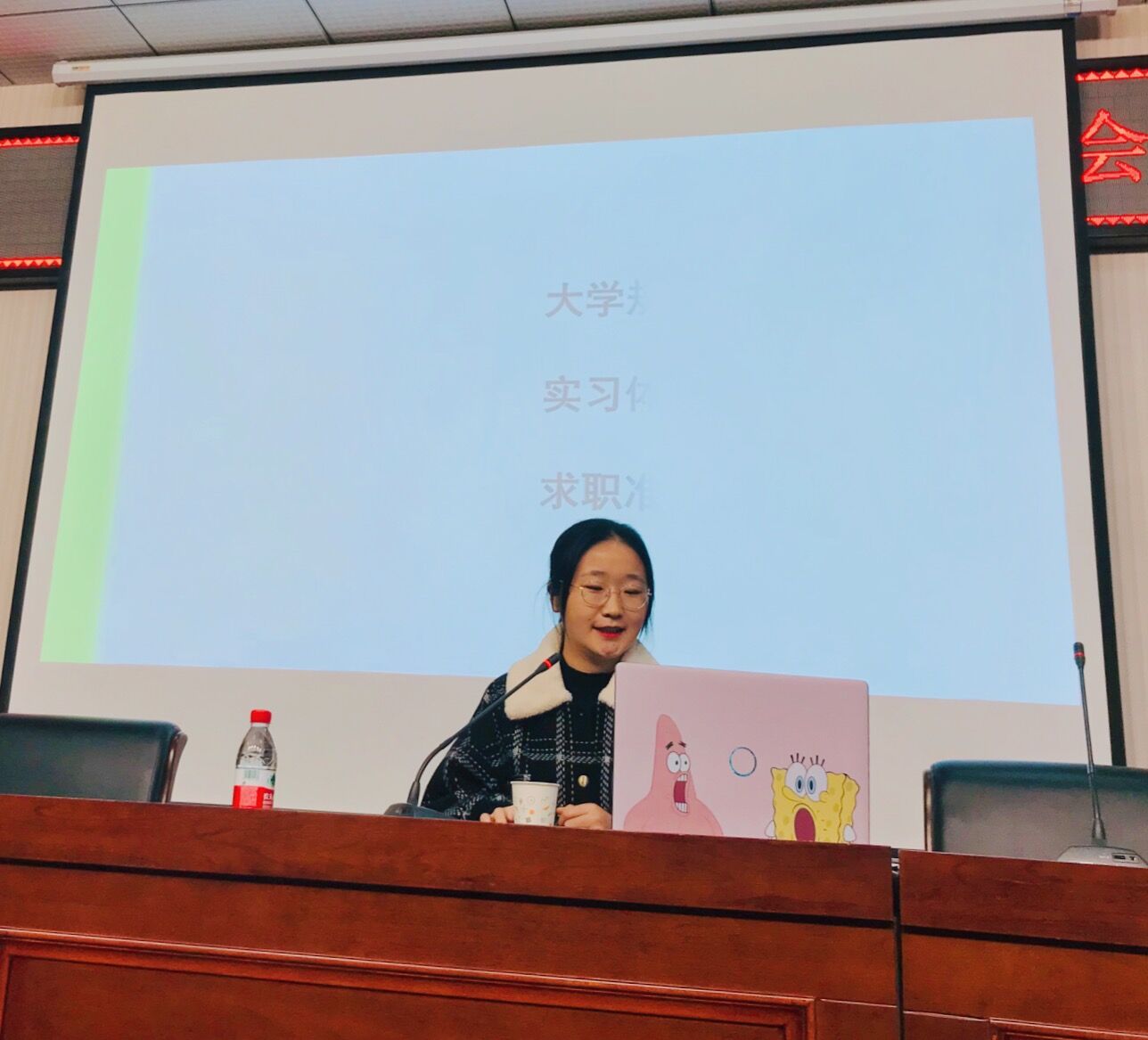 接下来,海艺欣以“人生之路靠自己”为主题做经验分享。她一直从事外国语学院记者团编辑工作,也曾参与"丝路·逐梦"支教队赴新疆支教,本学期在华师一附中汤逊湖学校实习时被评为“优秀实习生”,已签约库尔勒州二中。她从大学规划、实习体会、求职准备三个方面展开。她认为大学期间我们应当掌握专业知识能力,有一定的社会实践活动和现代教育技术水平,同时也因当积极担任学生工作。她指出:善于规划自己的时间才会比别人走的更远。