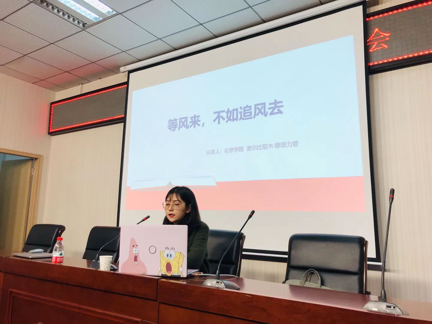 最后,由麦尔比耶木·穆塔力普带来分享,她曾获少数民族优秀学生奖学金,是“丝路·逐梦”支教队成员,连续四年担任班级生活委员,现担任化学学院2019级红石榴提升组副组长。她分享的主题是“等风来,不如追风去”,在分享中同学们看到了她的未雨绸缪和厚积薄发。面对实习招聘,她向大家提供了各种前期准备“干货”,从实习前中后三个阶段到就业,提出宝贵的意见和建议。
