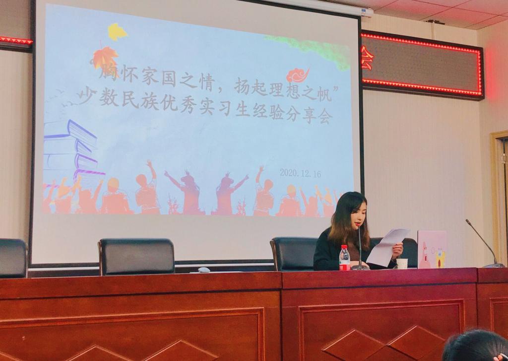 12月17日中午,由我校本科生院(党委学生工作部(人武部))主办、美美与共民族团结教育工作室承办、红石榴成长园民族社协办的“胸怀家国之情,扬起理想之帆”少数民族优秀实习生经验分享会在大学生活动中心403会议室成功举办。我校民族办全体老师出席本次活动,来自不同学院、不同民族的百余名同学到场聆听,红石榴成长园民族社社长阿依木古丽担任主持。