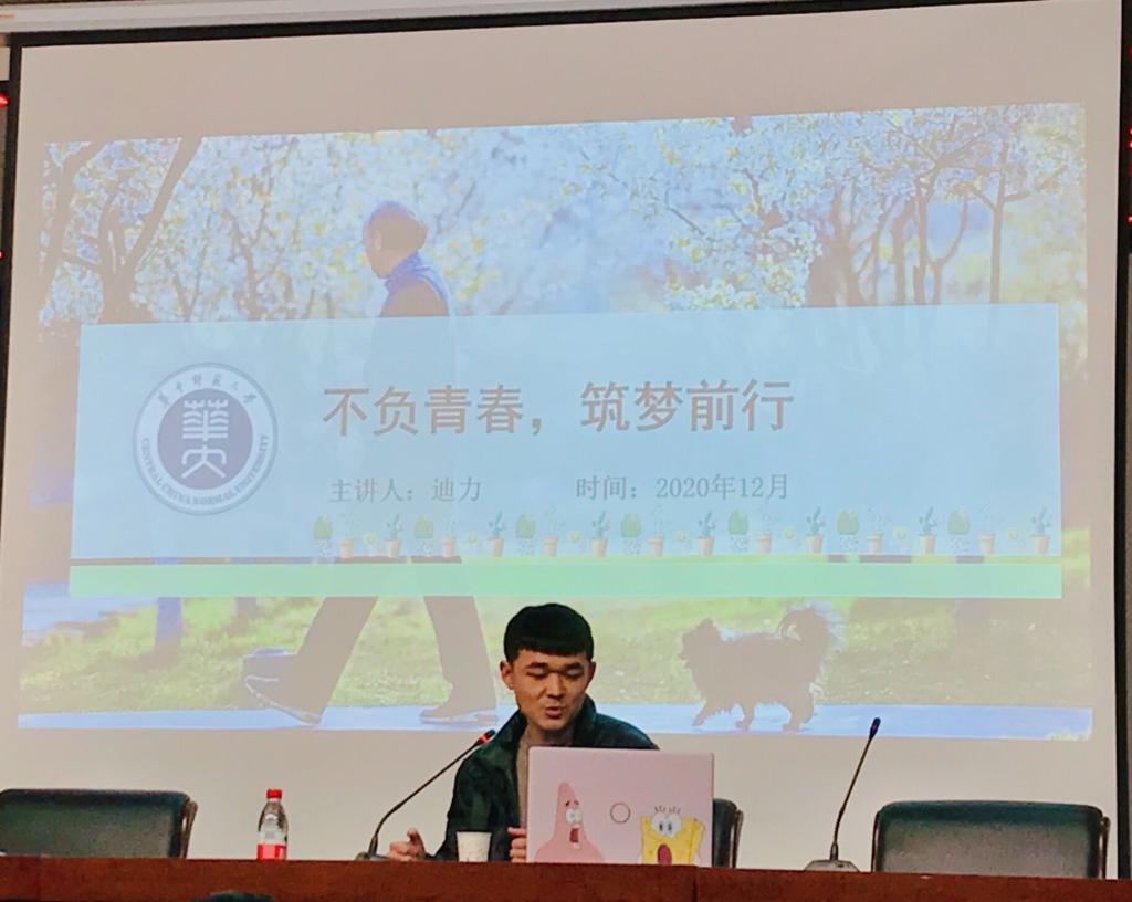 紧接着,迪力木热提江·迪力夏提做分享报告。他连续两年荣获华中师范大学"体育道德奖"、数学与统计学学院"优秀班长",也曾获得少数民族奖学金、被评为“预科优秀毕业生”,现已签约乌鲁木齐市第十中学。他分享的主题是“不负青春,筑梦前行”,以实习经历和学校考核流程两部分向我们耐心解答实习收获。分享过程中,他用幽默风趣的话语带领大家走进招聘和面试,他详细介绍他的实习工作安排,围绕“讲了什么?发现什么问题?怎样解决问题?”进行总结,同时也详细解答了面试时会遇到的各种问题。
