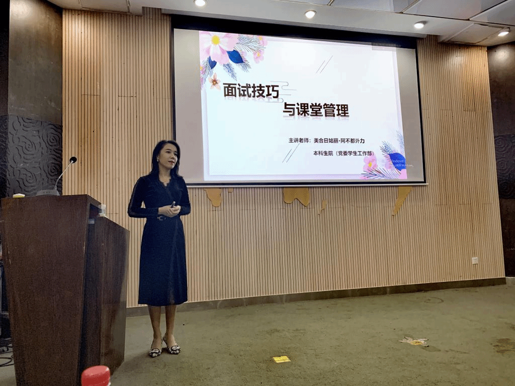 10月23日下午,由本科生院(党委学生工作部(人武部))主办、民族团结教育工作室、红石榴民族工作坊承办的以“胸怀家国之情,扬起理想之帆”为主题的第二届少数民族学生生涯导航月活动系列讲座(三)“面试技巧与课堂管理”在10号楼报告厅成功举办。本场讲座由本科生院(党委学生工作部)少数民族专职辅导员美合日姑丽老师主讲,民族事务办公室全体老师出席,来自不同学院、不同民族的学生到场聆听,阿力夏特老师主持。