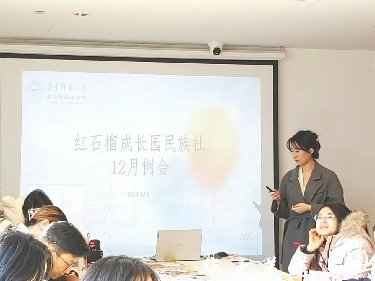 凛冬已至,时光如流水,一学期匆匆而过。为全面总结本学期民族社工作安排,进一步加强社团成员凝聚力。12月6日,华中师范大学红石榴成长园民族社秋季学期总结大会在华大民族团结进步之家顺利进行。本次例会邀请第八届社团指导老师热米拉出席,全体社团成员参加,由社长徐鸣溪主持。