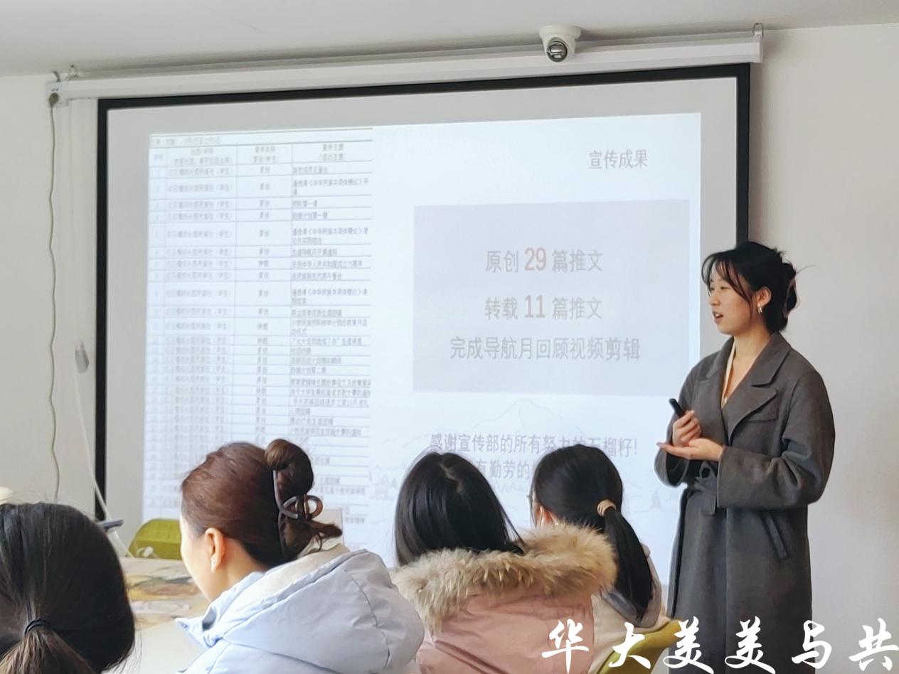 随后,徐鸣溪对本学期社团工作进行全面总结,详细回顾了生涯导航月系列、助推计划等相关活动内容,并公示本学期社团成员考勤情况。其中,她特别强调本学期社团宣传工作在大家的努力下成果显著,截至目前共发表原创推文29篇,转载推文11篇,完成一个视频制作。丰富的宣传成果不仅彰显社团宣传部门高效的团队写作能力和专业素养,更为社团在校内外形象塑造与影响力提升奠定坚实基础。