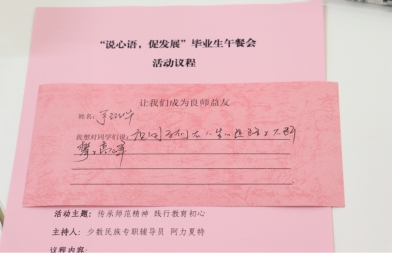 5月5日,由党委学生工作部主办、美美与共民族团结教育工作室承办的“说心语,促发展”毕业生午餐会活动在大学生学习发展中心203活动室顺利举行。本次活动邀请到本科生院招生办公室张德华、学工部就业处杨国强、学工部民族事务办公室全体教师,2018、2019级各民族学生代表参加,活动由少数民族专职辅导员阿力夏特主持。