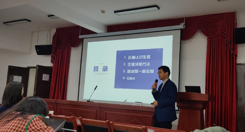 随后,郎东鹏从正确认识生涯、生涯决策方法、就业是一种态度三方面展开讲座内容。他首先向大家明确了“生涯”的内涵,并从生涯组成要素、职业选择的偶然性等方面对生涯进行概述,帮助同学们正确认识生涯。他指出,如何做好生涯决策,有多个角度,多种方法,而对于优势的探索与识别则是人类认识生涯选择的最新成果,也是比较可行的方法,对于自己的职业选择则需要保持乐业、善业和适业。最后,他还对就业态度选择进行了观念阐释,并重点强调了秋招的重要性,“秋招包含了80%左右的就业机会,大家需要早做打算”。