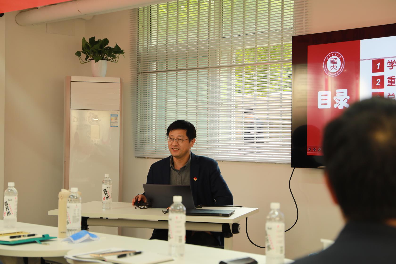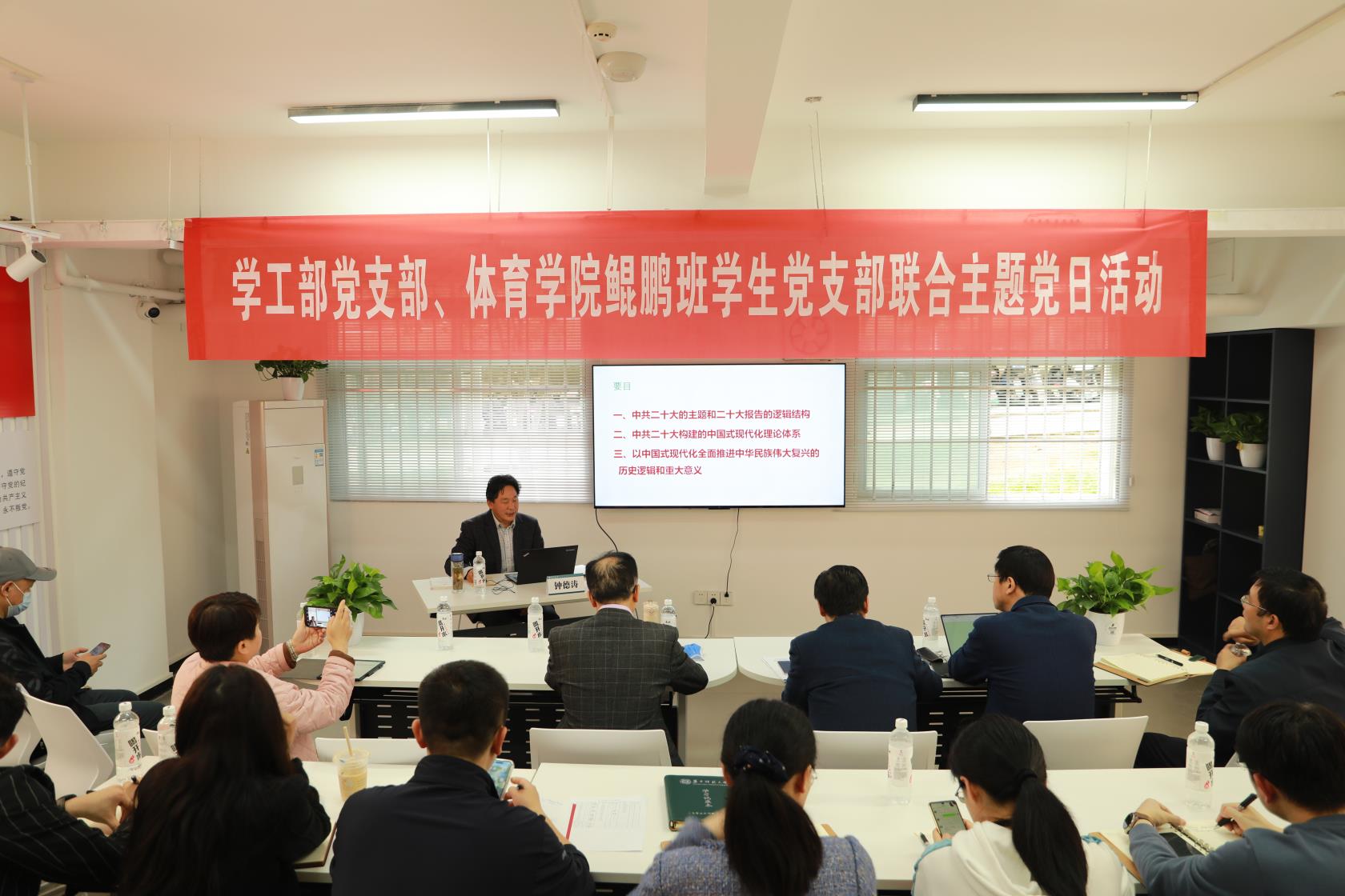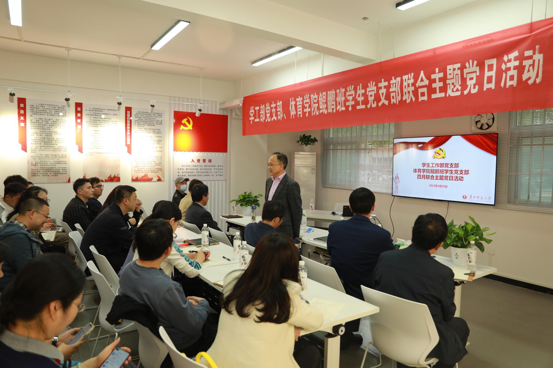 4月28日下午,学工部党支部、体育学院鲲鹏班学生党支部在南湖4栋学生社区服务中心党员活动室联合开展四月主题党日活动。马克思主义学院党史专家、博士生导师钟德涛教授受邀参加本次活动。活动由学工部支部书记王茂胜主持。