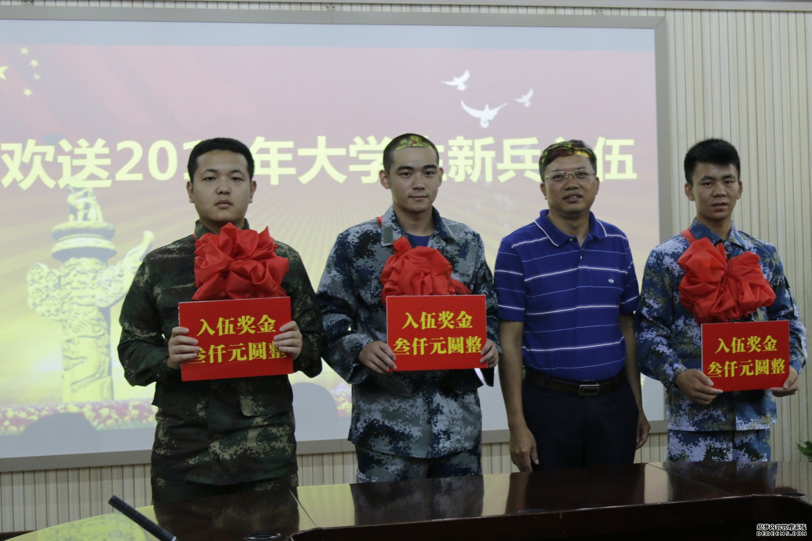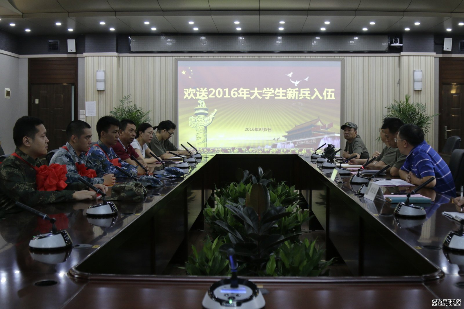 9号上午,我校入伍战士欢送会在行政楼一楼会议室完满举行,欢送三名入伍战士廖力为、马骏骁、简海斌。学工(人武)部部长刘宏达主持会议,校党委副书记覃红发表讲话,生命科学学院副书记金新利,体育学院副书记胡国良,以及战士简海斌父亲出席。