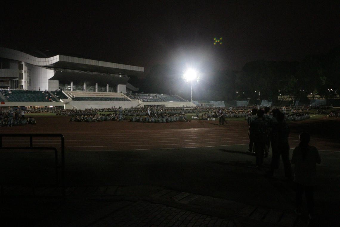 最后,全体新生平安回到佑铭田径场休整,晚10点按计划有序回寝。