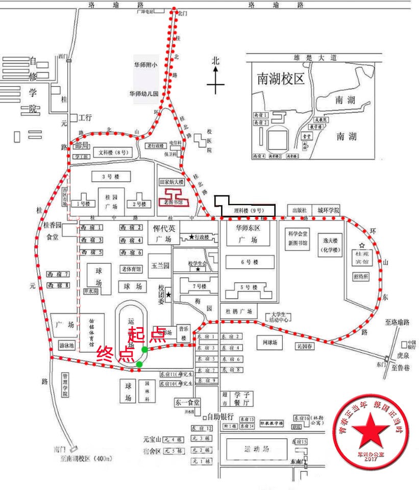 本届拉练活动路线为:佑铭田径场——大学生活动中心——环山东路——桂中路——桂北路——环山北路——桂元路——佑铭田径场。