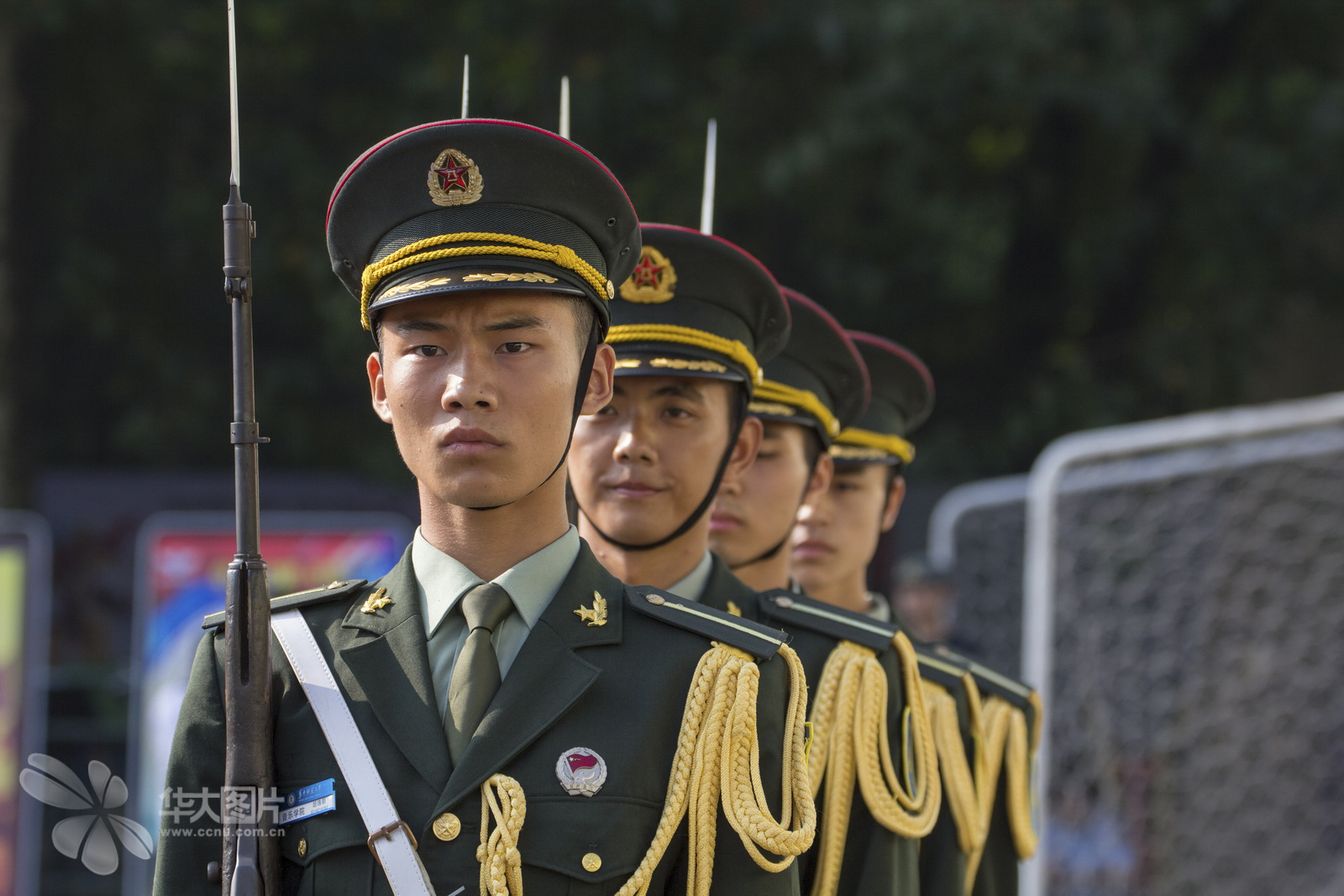 合唱团合唱《强军战歌》《团结就是力量》 汇报表演开始 标兵就位 |