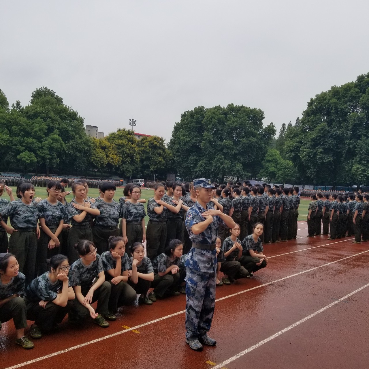 大树下躲雨的碧绿,操场上的昂扬,以及穿梭在“绿”中的“宝蓝”与“雪白”,虽说没戴眼镜的我看起来有些模糊,可此情此景已被印在心上,多年以后想起嘴角必定是上扬的吧,我可爱又善良的教官和青春活泼的大计算机学院的同伴。
