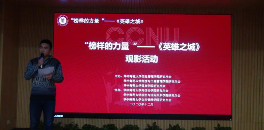 To carry forward the great spirit of combating the COVID-19 epidemic and salute all the front-line medical workers, a movie watching activity entitled with “A Star is Enough to Lighten Numerous Families” to watch the documentary A City of Heroes was launched at 7:00 P.M. on December 6 at the conference hall on the tenth floor of Nanhu comprehensive building. The activity was launched by the postgraduate association of school of economics and business administration, school of information management, and school of sports. 150 postgraduates attended this activity. The documentary City of Heroes was made by more than 60 reporters of Xinhua News Agency who went deep into the dangerous zones of COVID-19 over a period of more than two months and summarized the documentary materials by interviewing front-line medical workers, the patients and volunteers, truly recording the touching historical moments of Wuhan's fight against the epidemic.