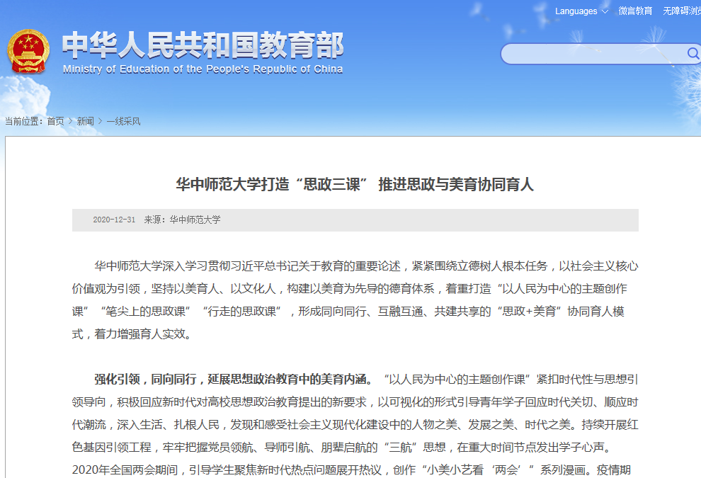 Recently, the column of "Front-line Collection of Style" on the portal website of the Ministry of Education, with the title of "CCNU Creates ‘Three Ideological and Political Courses’ and Promotes the Collaborative Education of Ideological and Political and Aesthetic Education", reported and promoted the relevant measures of the collaborative education of ideological and political and aesthetic education in our School of Fine Arts. It was reported that, CCNU deeply learned and carried out Xi Jinping’s important remarks on education, tightly surrounded the fundamental task on strengthening moral education and cultivating people, and guided by Socialist Core Values, CCNU persisted in cultivating people with aesthetic education and touching people with culture, constructed the moral education system with aesthetic education as the guide, focused on building “A People-centered Theme Creation Class”, “Ideological and Political Courses on the Nib”, “The Walking Ideological and Political Courses”, and formed a collaborative education model of "ideological and political + aesthetic education", which was synthetic counterparts, mutual accommodation and co-construction and sharing, and CCNU was making efforts to improve the effectiveness of education.