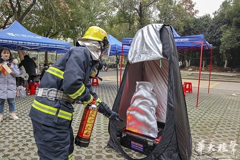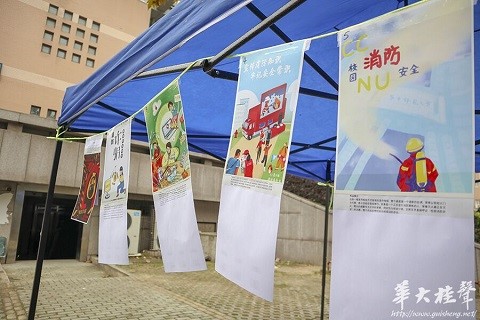 This event in the main campus was held in the grove in the east district, which was divided into 2 parts----original works exhibition and campus safety assembly. Moreover, the second part contained a series of experiences including quiz about safety, distinction of security signs and lively experiences. Students were able to gain points during the quiz and exchange them into some gifts from the service desk. Meanwhile, the participants of the distinction ought to pick table tennis balls that was printed with fire control signs by using chopsticks from the basins. Apart from that, players of the experiences could try firefighter uniform as well as the fire control facilities such as fire extinguishers. Besides, the fire put out experience and the simulated smoky event have also attracted large number of people, a lot of students could not wait to take part in.