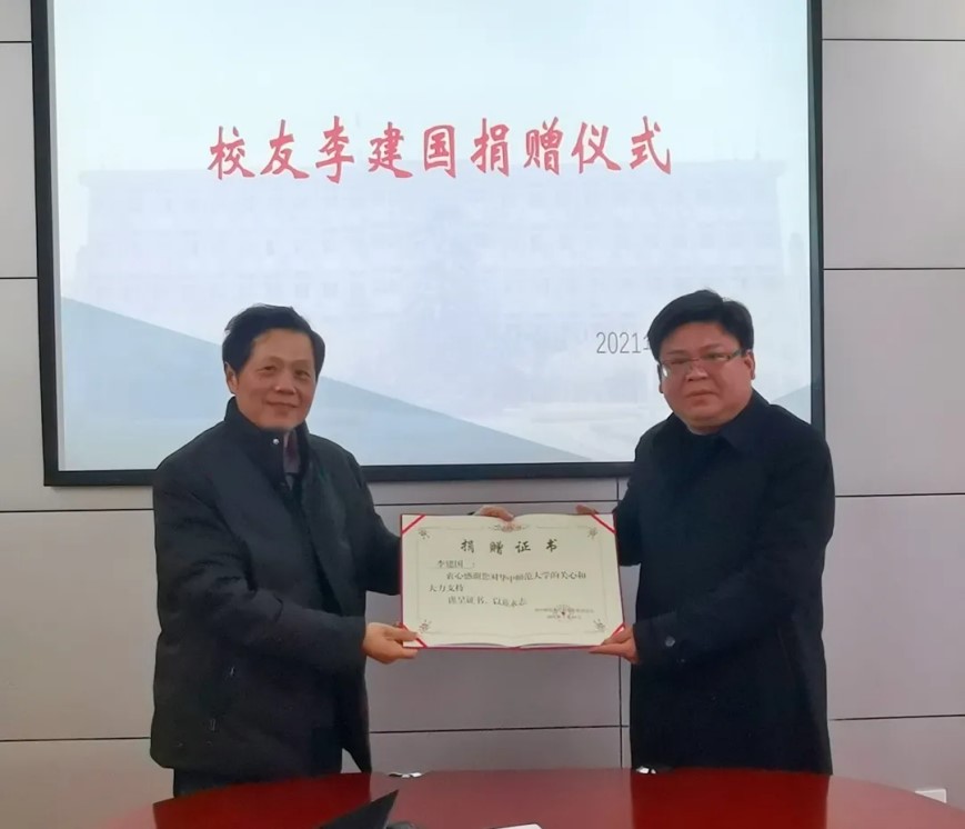 Wang Zhong awarded the certificate to Li Jianguo on behalf of the School and thanked him for not forgetting CCNU and conveying gratitude through donations. CCNU is always staying heart to heart with alumni and hopes to further strengthen the contact, care for and support each other and development together. CCNU also welcomes alumni to visit her often.