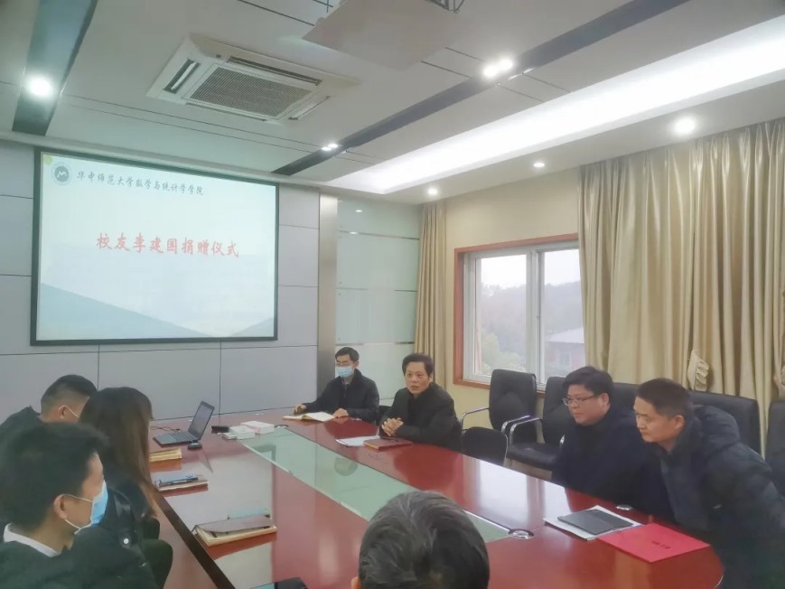 On the afternoon of February 28, the donation ceremony of Alumnus Li Jianguo of the School of Mathematics and Statistics was successfully held in the conference room on the fourth floor of Building 6. Li Jianguo, the alumnus of 1999 of the School, also the gold medal coach of the Olympic Games of the First Affiliated Middle School of CCNU, Wang Zhong, Secretary of the college Party committee, Zhang Jun and Tian Jun, deputy Secretary of the college Party committee and the representatives of the School attended this ceremony.