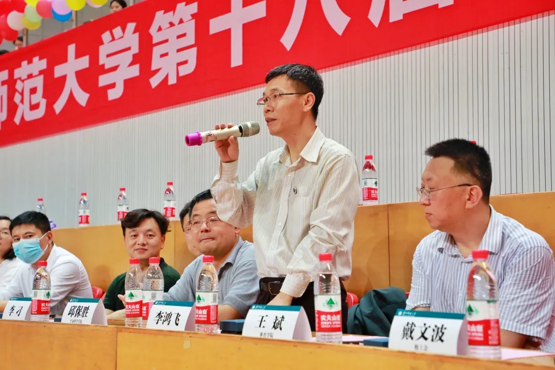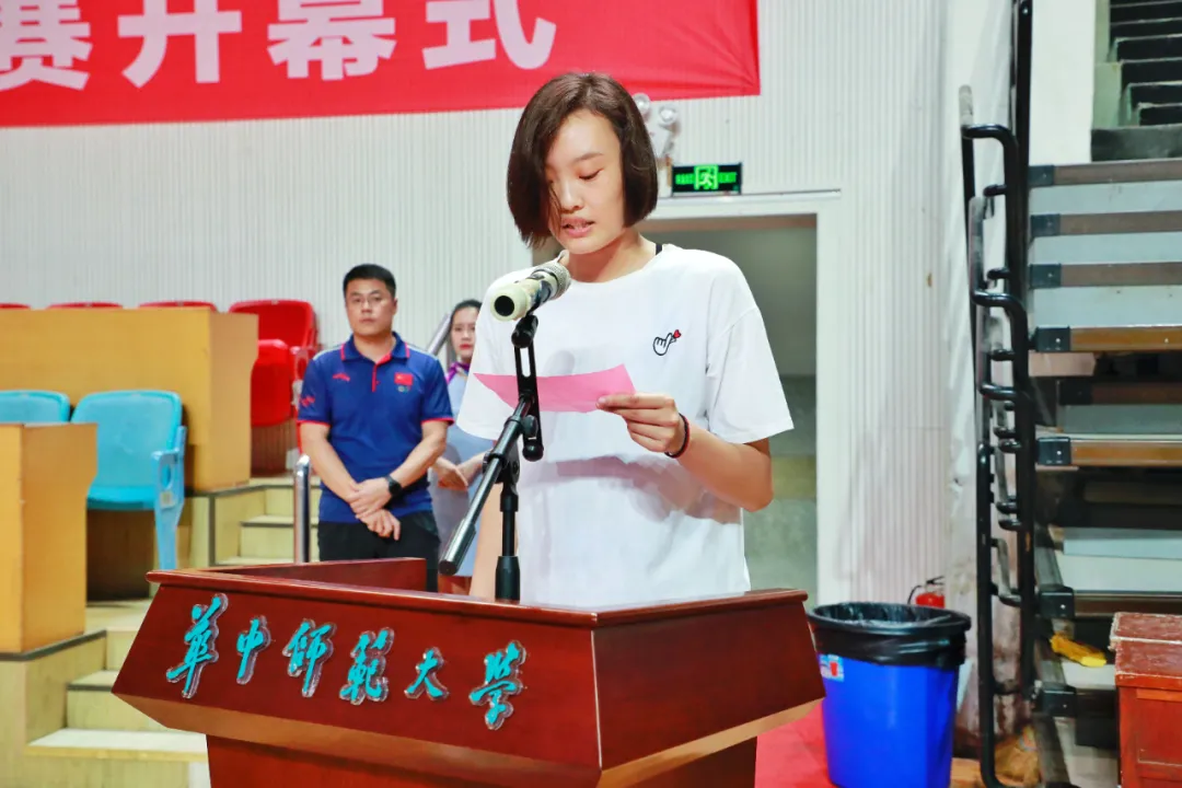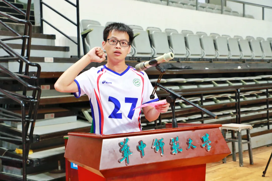 Subsequently, Wang Bin and Qiu Baosheng delivered their speeches respectively. Wang Bin pointed out that our school had always attached great importance to mass sports work and always placed the mass sports work of college students in a significant position. He believed that the “Life Cup” would be a wonderful “sports feast” for all the teachers and students in May when the campus was full of flowers and green laurel trees". Qiu Bausheng stressed that the “Life Cup” volleyball league tournament is the top sports competition of CCNU, and it was held at the right time. It actively responded to the call of “getting off the Internet, walking out of the dormitory and heading for the playground”, which was beneficial to students to enhance their physical fitness and improve their personality, as well as interpreted the sports culture. Actually, the “Life Cup” tournament has been gradually engraved into the culture of the School of Life Sciences, leaving a mark with the characteristics of life. Then, the representative of athletes and the representative of referees took their turn to take the oath. Li Hongfei announced the opening of the 18th “Life Cup” Volleyball League Tournament of CCNU.