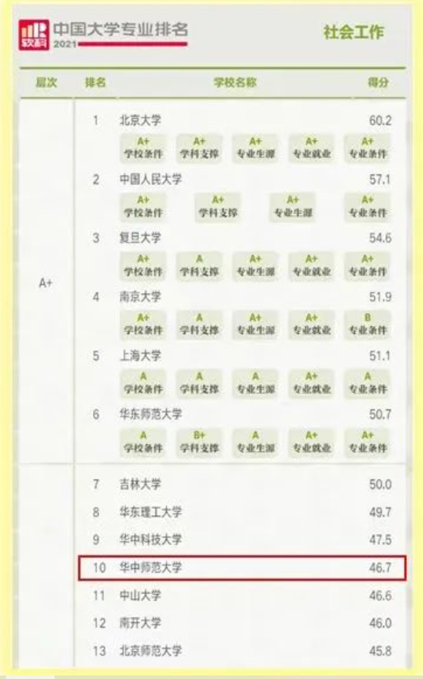 The major in social work of the School of Sociology of CCNU was selected as the national First-class undergraduate major in 2020,and ranked 10th in the soft science majors in 2021.