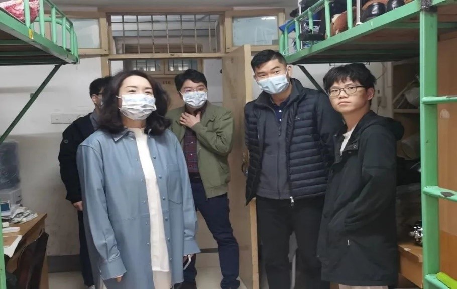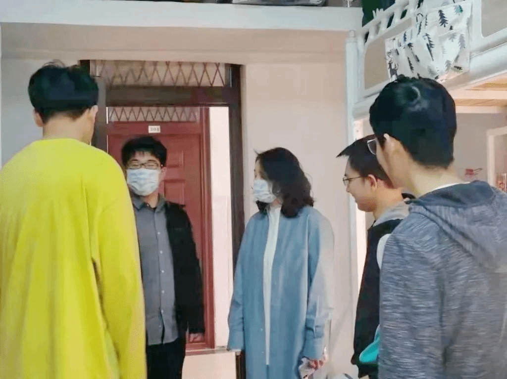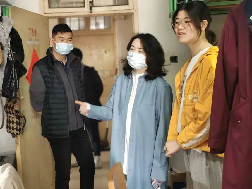 At the boy’s hostel of unit 4 in the Eastern dormitory area, Tian Jun and her colleague had a closer communication with the students on life and studying. The college leaders listened carefully to the students' opinions and suggestions on college management and services. They also asked them about the problems of clothing, food, housing, transportation, and their adaptation to school life. The counselors reminded the students to arouse high awareness of fire and theft prevention and asked them to take positive measures according to the current epidemic control requirements, such as gathering less, washing hands more often, ventilating more, wearing masks, and strictly implementing the epidemic prevention requirement of "not leaving school unless necessary".