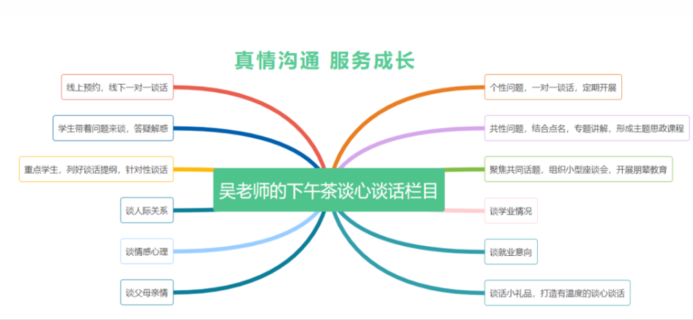 The "six and one" work deployment for counselors is the integration of counselors' daily work. Before this, counselors in many colleges carried out their work in this way. The concept of "six and one" work was clearly proposed, which was a summary, concise and improvement of counselors' daily work. Around the "six" work, the counselor Wu Wenjie also developed his own work plans. He took the "afternoon tea" as the breakthrough point, relied on the subject education graduate education courses, panel, sharing and network ideological education platform, etc, and then built "afternoon tea" ideological education system in order to solve the confusions of students and service for their growth.