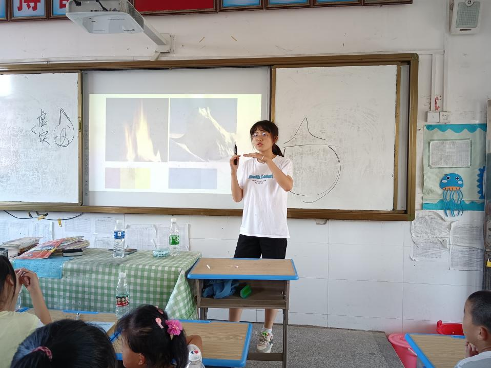 In art class, Qin Yuxuan showed students the charm of colors. From knowing colors, feeling colors to representing colors, the nail-biting teaching segments were very attractive. From theoretical study to hands-on practice, the layer upon layer progressive learning style had obvious effect. Qin Yuxuan took the intuitive feeling towards colors of students as entry point to explain art technical terms, such as hues, brightness, purity and so on, which turned abstract theories into vivid comprehensible knowledge. In the meantime, Guo Yajing took the students to get closer to tie-dye— one of traditional Chinese manual dyeing technique. After briefly imparting the basic knowledge of tie-dye, she emphatically introduced Bai tie-dyeing, which was an intangible cultural heritage. She briefly taught several fundamental ways to create tie-dye through videos and emphasized that people should fasten the rope during the process to create beautiful patterns, which paved the way for students' following hands-on practice. At the end of the class, Guo Yajing called on the students to feel the charm of art, the unknown and traditional Chinese culture while they felt the charm of tie-dye.