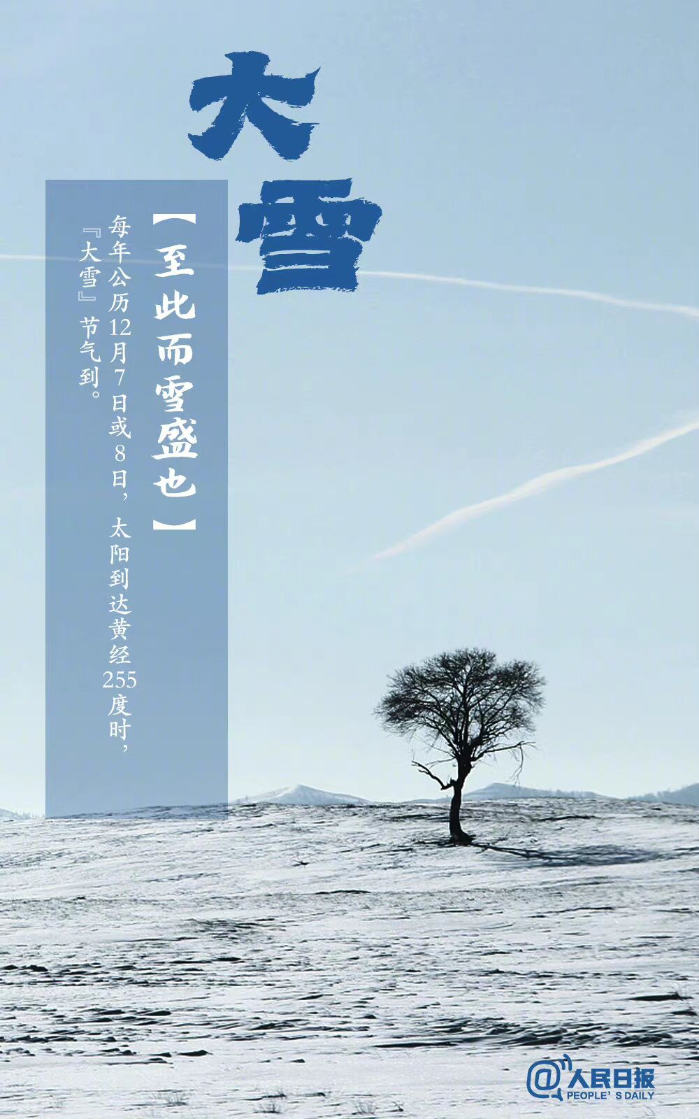 大雪,是二十四节气中的第二十一个节气,也是冬季的第三个节气,时间一般为每年公历12月6-8日。大雪标志着仲冬时节正式开始,节气的特点是气温显著下降、降水量增多。元吴澄说:“至此而雪盛也。”大雪的意思是天气更冷,降雪的可能性比小雪节气时更大了,并不指降雪量一定很大。