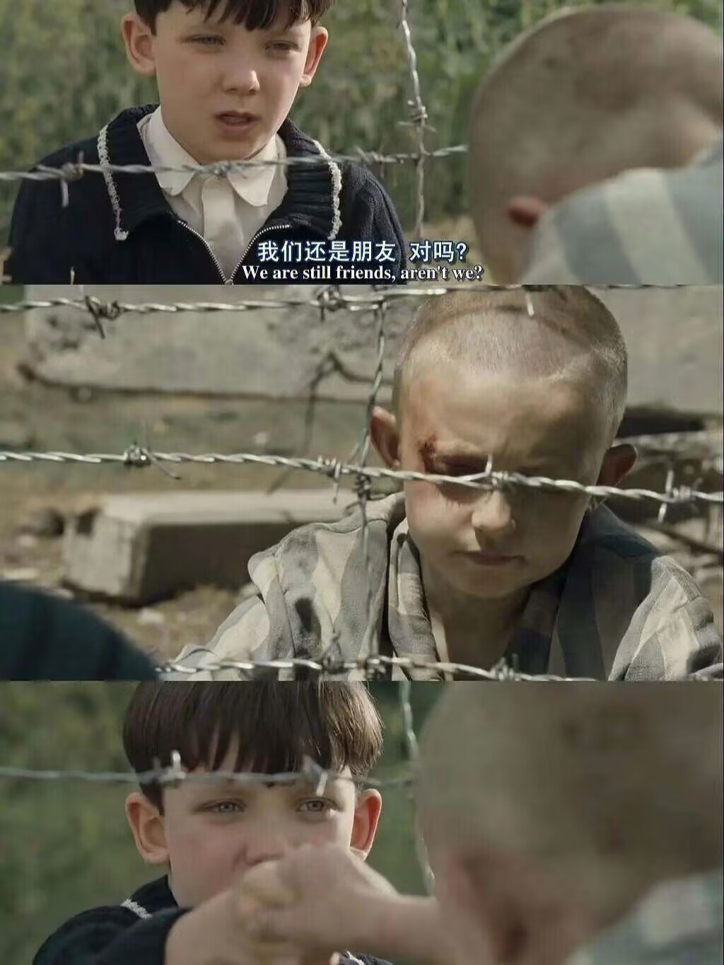 推开那扇沉重的铁门,进入到另一个世界——从未去过的“农场”。两个孩童隔着铁门建立起了友情:在布鲁诺偷偷带给施穆尔的巧克力和三明治里,在两人隔着铁丝网下棋里,在因为布鲁诺的胆小施穆尔受到挨打后又原谅布鲁诺的友谊里……在看到军官打骂犹太人,在听说犹太人的罪行与自己所见到的完全不符后,小布鲁诺选择用谎言来掩盖周围的一切。