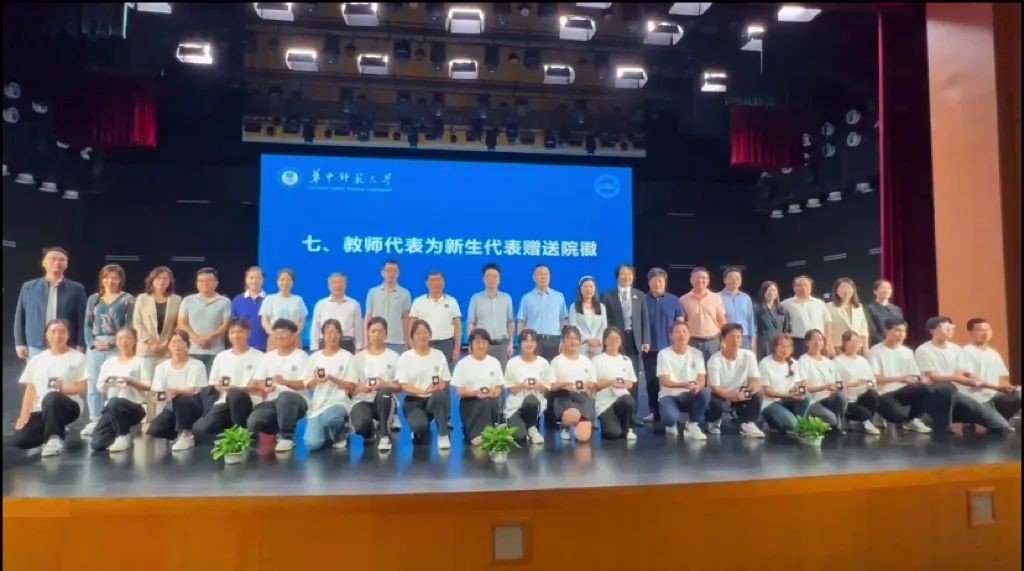 In the sixth item of the conference, the faculty representatives presented the college emblem to the freshmen representatives and took a group photo.