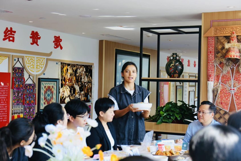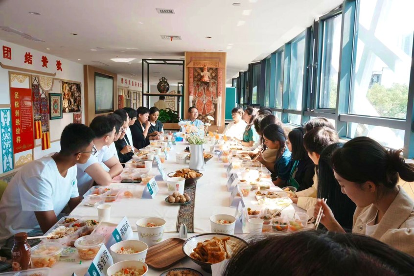 The lunch meeting began with students from different ethnic groups introducing their own cuisines. Huang Jinxing, a Tujia student, brought miso cake, a food that Tujia people must eat during harvest festivals; Aijieer, a Uyghur student, brought special pilafan, a symbol of reunion; Solongga, a Mongolian student, brought salty milk tea and introduced the ancient tea horse road used to buy tea cakes for trade with the Central Plains in the ancient Northwest region; Yang Yuxin, a Zhuang student, introduced the ingredients and effects of the local specialty food Turtle paste.