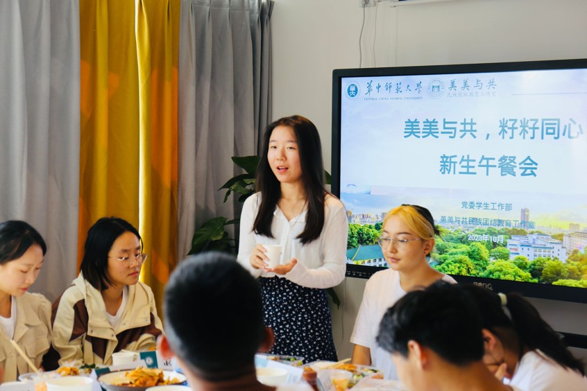 Voice of CCNU In order to further implement the concept of "education with temperature" and understand the adaptability of freshmen at school, at noon on October 17, the first activity of the fifth Minority Students' Career Navigation Month, sponsored by the Student Work Department of the Party Committee and hosted by the Communist National Unity Education Studio, was successfully held. Located on the fifth floor of Building B of the new University Student Activity Center, Huada National Unity and Progress House welcomed its first group of "guests". The event invited Yang Jun, Vice Minister of the Department of Student Affairs, Wu Jiancheng, Deputy Director of the Department of Student Affairs, Li Chao, Office of Undergraduate Affairs and School Management, Sun Danxia, library to attend, all the teachers of the Office of Ethnic Unity Education of the Department of Student Affairs, representatives of 2023 students from 21 colleges and 13 ethnic groups to participate in the activity, the lunch was hosted by teacher Meheli Guri. In a relaxed and pleasant lunch atmosphere, teachers and students share special food and chat about GUI Zi Xinsheng.