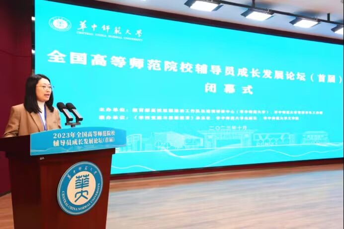 (Correspondent: Xu Henghong, Li Xiaojia, Qin Yisong, Ning Jingbo) On the morning of October 27th, the closing ceremony of the First National Forum on the Growth and Development of Counselors in Higher Normal Universities was held in the lecture hall on the first floor of the Humanities Comprehensive Building. Li Diao, Deputy Minister of Office of Student Affairs and Director of the Ideological and Political Affairs Department, Li Honglei, Deputy Secretary of the Party Committee of School of Chinese language and Literature, the organizer Ma Ying, Deputy Secretary of the Party Committee of College of Physical Science and Technology, and Zhang Dehua, Deputy Secretary of the Party Committee of School of Physical Education and Sports, as well as nearly one hundred counselors and other ideological and political elites from 30 higher normal universities across the country, attended the closing ceremony. The ceremony was presided over by Li Xianling, Deputy Director of the Ideological and Political Department of Office of Student Affairs.