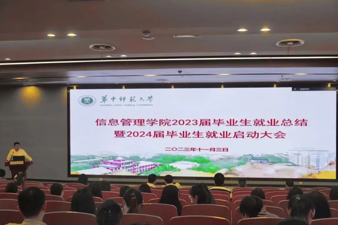 On the afternoon of November 3, the employment summary of 2023 graduates of the School of Information Management and the employment launch conference of 2024 graduates were held in the lecture hall on the first floor of the Nanhu Complex Building. The meeting summarized the experience and shortcomings of the employment of graduates of 2023, analyzed the employment situation and policies in 2024, and fully deployed the employment work of students in 2024. All faculty members, all graduates of the Class of 2024 and some non-graduating graduate students attended the conference, and students' parents attended the conference online. The meeting was chaired by Vice President Cao Gaohui.