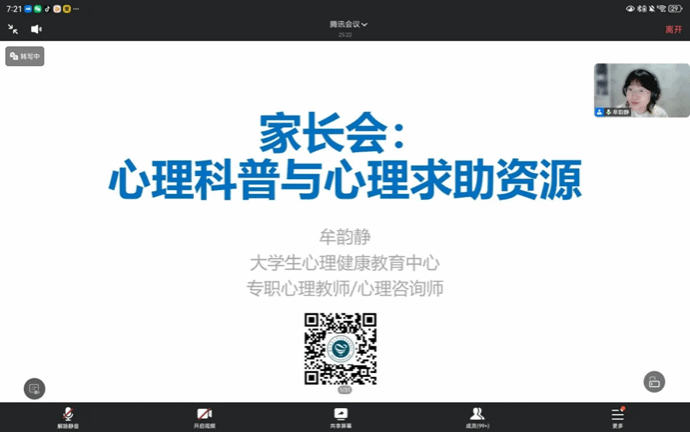 Mu Yunjing gave a special lecture on mental health. She focused on the psychological characteristics of college students, common psychological problems and help resources and other topics to popularize science, introduced the school psychological center and supportive social network, to help parents better understand and cope with the psychological needs of students, care for students together, so that students better growth and development.