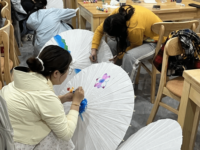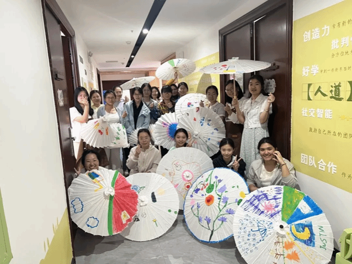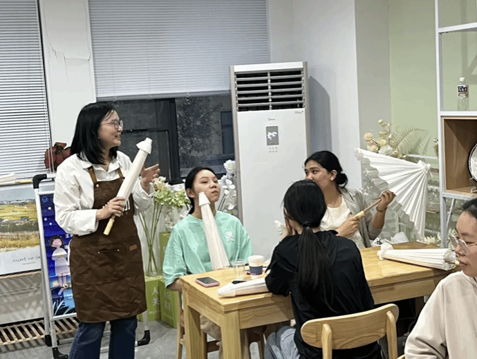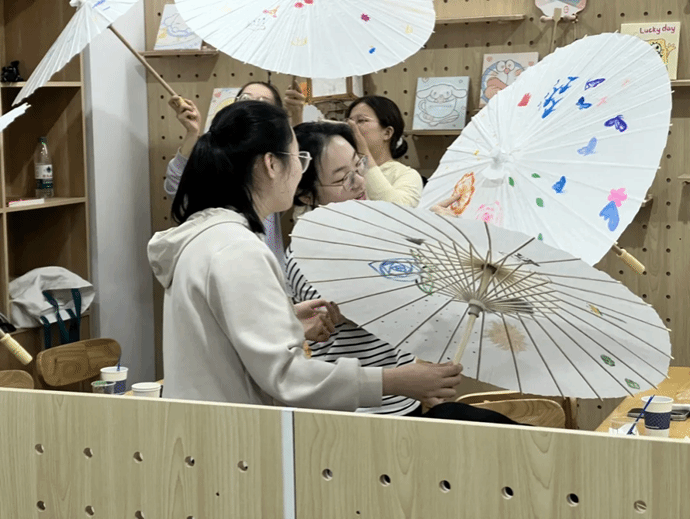 The subsequent interactive session of "Holding an umbrella for Others" brought the atmosphere to a climax. Participants passed on their works in groups in a loop. Each person added new elements to the surface of others' umbrellas: some added a bright moon to their companions' starry sky umbrellas, some filled them with thriving vines, and others added scattered small flowers to them. This fusion of strokes that connect hearts makes each paper umbrella carry multiple kinds of kindness.