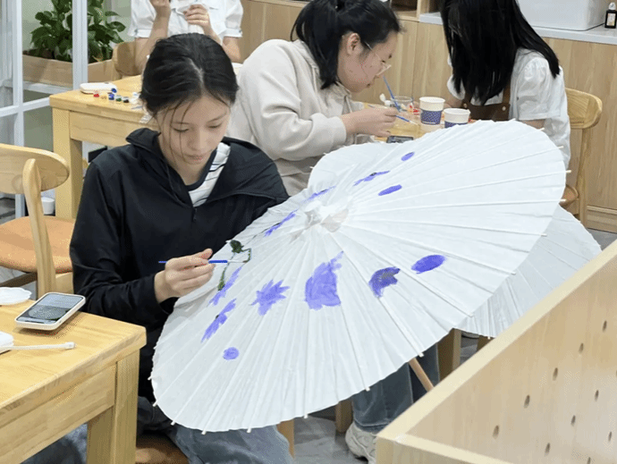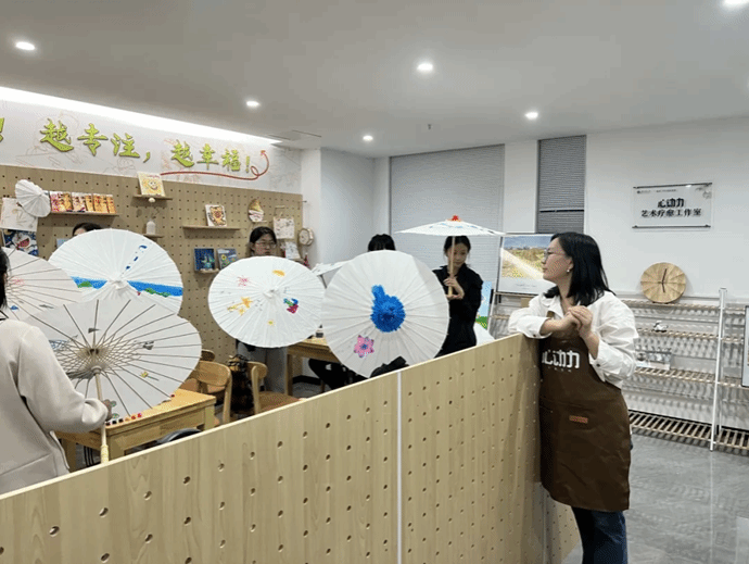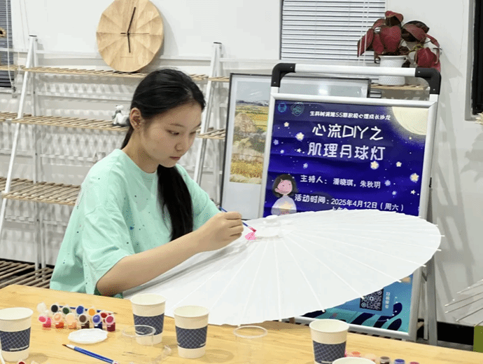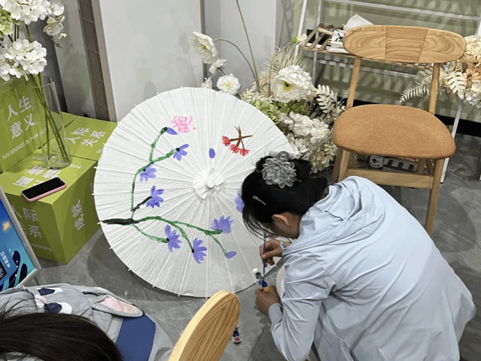 The event kicked off with the art therapy guidance of Teacher Yu Xuan. Participants first engaged in free creation on pure white oil-paper umbrellas. Some sketched sunflowers growing towards the sun, some diffused a soothing gradient of sunset glow, and some hid small planets at the top of the umbrellas. When painting, one can hear the voice within oneself. Participants said when flower patterns fell on the umbrella surface, "It's like sealing the touching moments of growth in the umbrella."