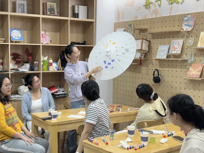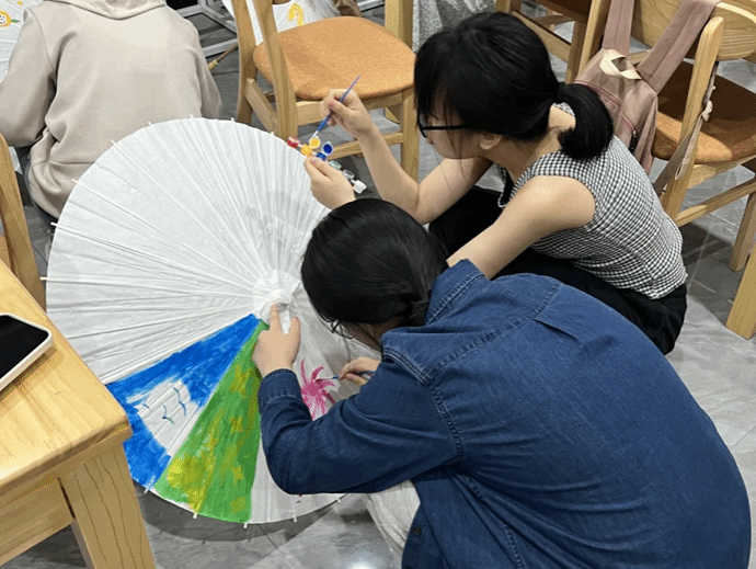At the Story Drift sharing session, participants formed groups with classmates who shared the same elements on the umbrella, sharing their creative experiences and feelings with each other. Then, holding their works, they told all the participants the emotional narrative behind this paper umbrella. A paper umbrella painted with grass and the ocean evokes resonance - happiness is all four seasons. Another umbrella featuring a landscape of mountains and waters carries the moment of enjoying the sunrise at Lingbo Gate with friends.